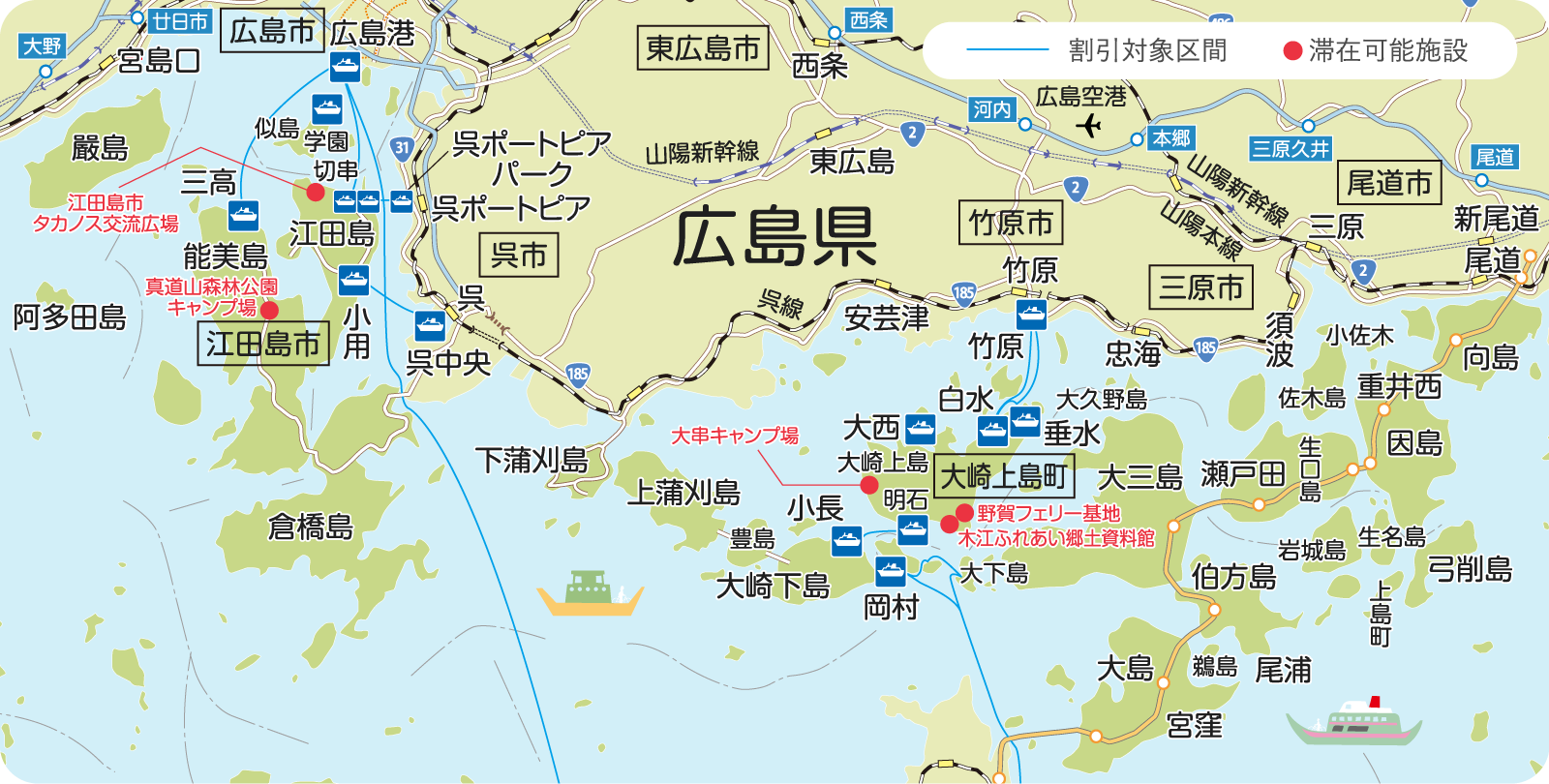 ※瀬戸内海汽船㈱・石崎汽船㈱ 宇品〜松山航路は、くるま旅クラブ会員の方のみ割引対象です。